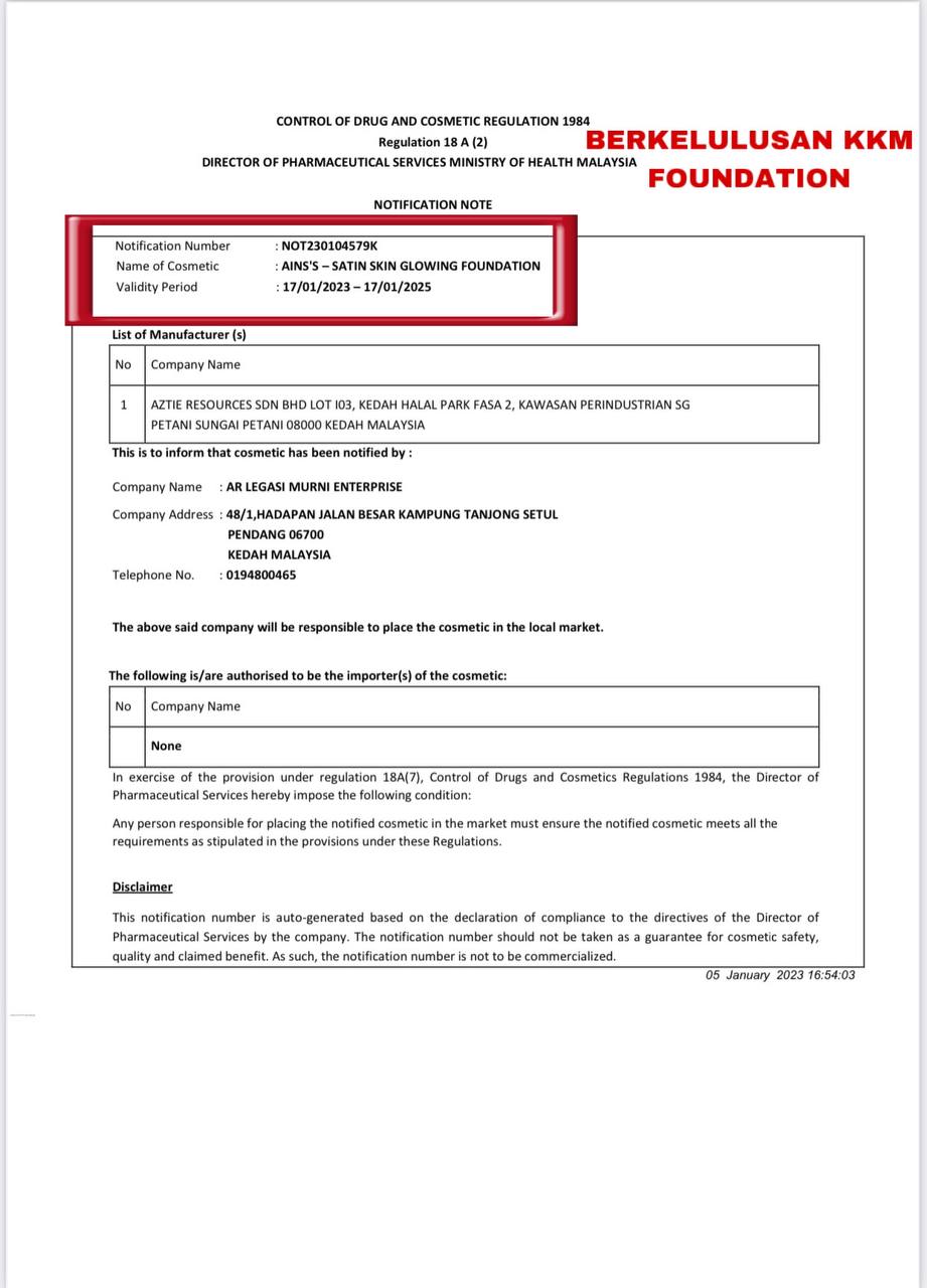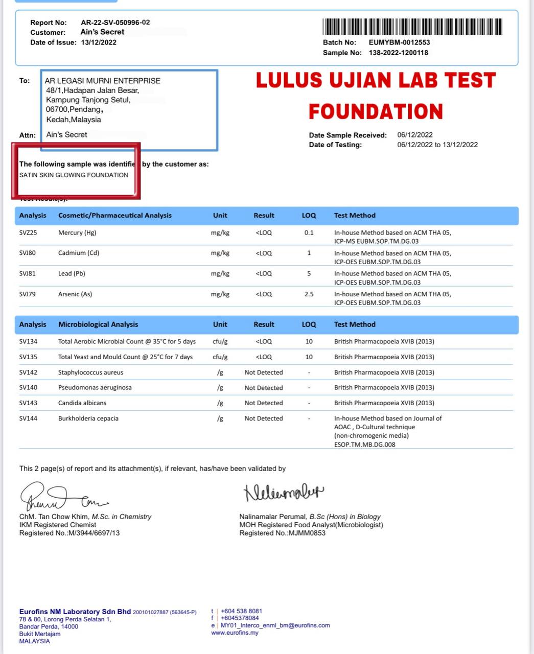 - Satin Skin Glowing Foundation mempunyai gabungan bahan-bahan yang sangat premium seperti Centella Asiatica Extract, Green Tea Extract, Golden Herbs dan Tara Plant.